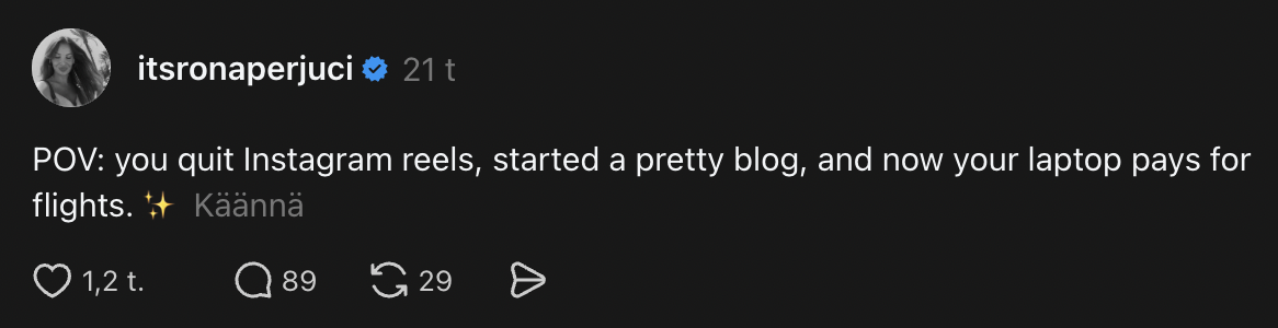 I posted something on Threads yesterday that I didn’t think much of at the time. Just a quick: “POV: you quit Instagram reels, started a pretty blog, and now your laptop pays for flights. ✨”
