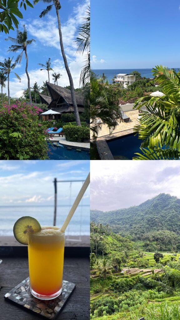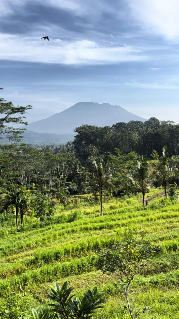 It’s not busy, but sitting by a villa pool, watching Mount Agung in the distance? That hits differently.